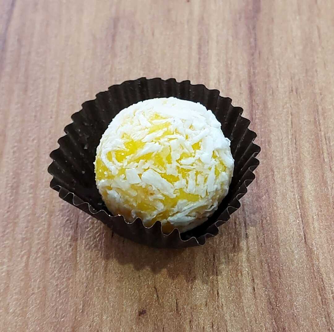 Doce de leite condensado com gemas e coco, finalizado com coco ralado. R$ 2,49